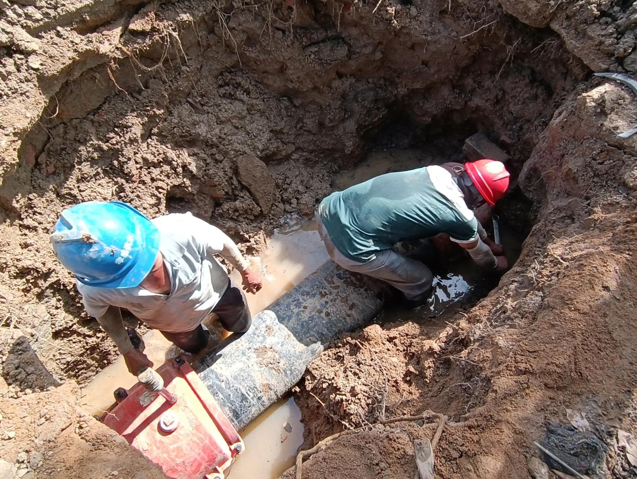 正值三伏天,天氣炎熱,氣溫高達40度。搶修人員絲毫不懼酷熱,他們在做好高溫防護后輪番上陣,有序推進搶修工作。經(jīng)過挖掘、清理,作業(yè)坑成型,破損的DN400管道露出水面。隨后,搶修工作緊鑼密鼓展開。經(jīng)過近8小時的奮戰(zhàn),于當(dāng)天下午4點完成了搶修任務(wù),從最大程度上減少了對附近居民及工商業(yè)用水造成的影響。