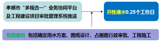 流程說明:供水企業(yè)通過孝感市“多規(guī)合一”業(yè)務(wù)協(xié)同平臺及工程建設(shè)項(xiàng)目審批管理系統(tǒng)推送獲取項(xiàng)目建設(shè)信息后主動(dòng)對接,先行開展確定用水方案、圖紙?jiān)O(shè)計(jì)、工程施工等服務(wù),辦理用水工程涉及的占道、掘路、占用綠地、伐移樹木等相關(guān)行政審批手續(xù),提前完成外線工程實(shí)施,為客戶提供“無感免申請”服務(wù)。客戶需要用水時(shí),0.25個(gè)工作日內(nèi)開栓通水。