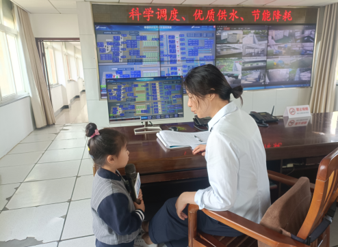 在調度中心,我公司工作人員告訴小朋友們,市民使用的水是從70公里外的漢江水源輸送過來的,經過處理后不間斷地輸送到千家萬戶。并用通俗易懂的方式講解了水從渾濁變清澈的處理過程。