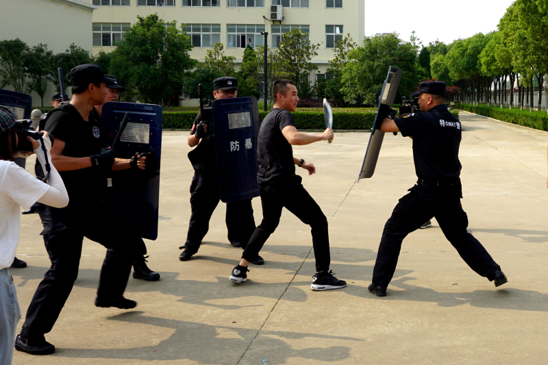 接警后,孝南公安分局巡邏大隊(duì)、治安大隊(duì)和南大派出所組織了16名警察和特勤隊(duì)員荷槍實(shí)彈趕到現(xiàn)場(chǎng),并在現(xiàn)場(chǎng)指揮員的果斷指揮下迅速完成外圍監(jiān)守布防和內(nèi)線(xiàn)包圍突進(jìn),不到一分鐘就奪下兇器,干凈利落地將“暴恐分子”制服收押。