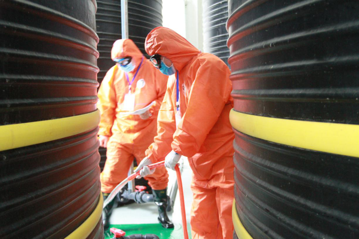 到達事故發生現場,醫療救護組迅速將受傷人員轉移至安全區域,按救護要求進行現場應急救護,并同時撥打120急救電話,將傷者送醫院救治。隨后現場處置組搶修人員穿戴防護服進入事故現場,關閉相連儲液罐的聯通閥門并找到漏點,用專業工具進行堵漏,在漏點周圍圍堰攔截泄漏的次氯酸鈉,并進行稀釋、中和,然后收集處理最后將罐體中的剩余次氯酸鈉溶液轉至備用罐中。在確認事故現場漏點無泄漏后匯報給現場總指揮。演練結束后,現場指揮進行了總結,認真分析了演練過程中暴露出的一些問題,為處置預案的進一步完善提供了一手資料。